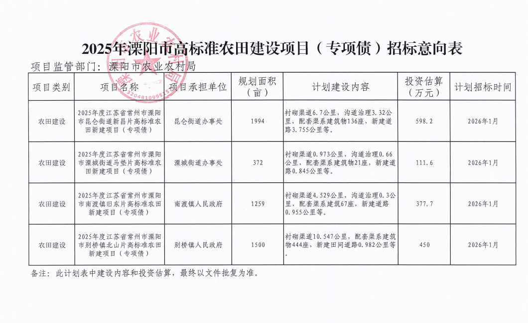 2025年溧阳市高标准农田建设项目(专项债)招标意向表